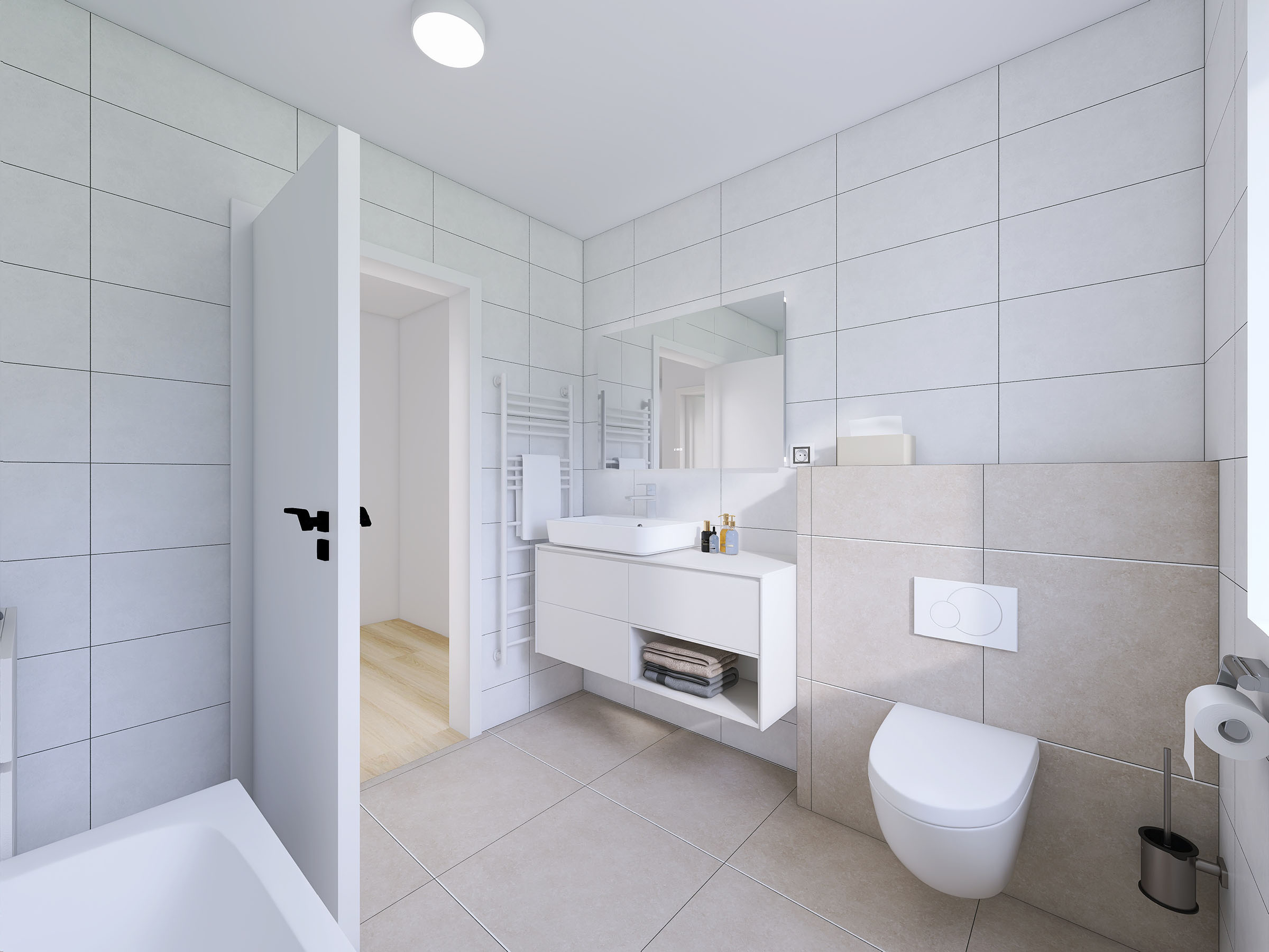 Klienti mají možnost volby finálních povrchových úprav interiéru – podlahových krytin, dveří, obkladů i dlažby – dle vlastního vkusu a preferencí.